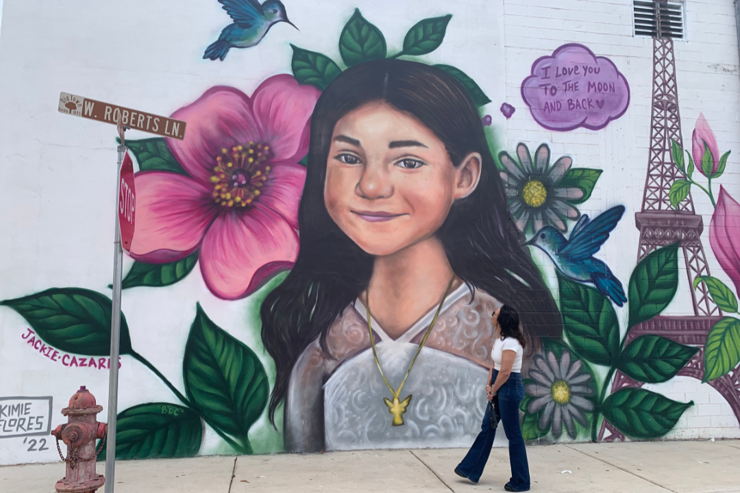 Maria Hinojosa walks in front of a mural with the image of Jackie Cazares, a victim of the Uvalde massacre. Reynaldo Leaños, Jr./Futuro Media